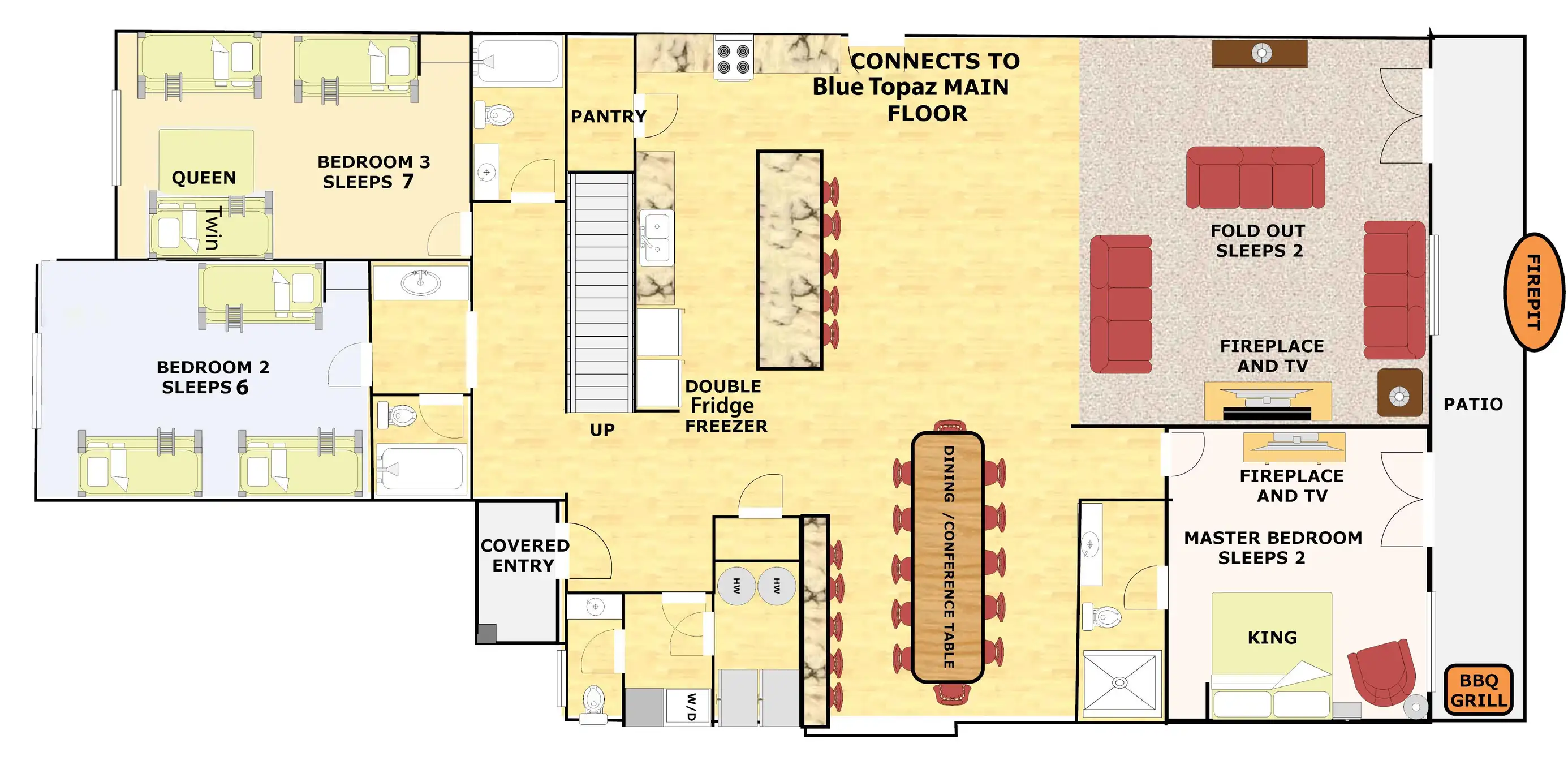 The Cobalt unit is the North unit in the Triplex. It is fully furnished and sleeps 38 guests on 4369 sq ft, with 8 bedrooms, 6.5 baths, patio with fire pit, and 2 large great rooms.