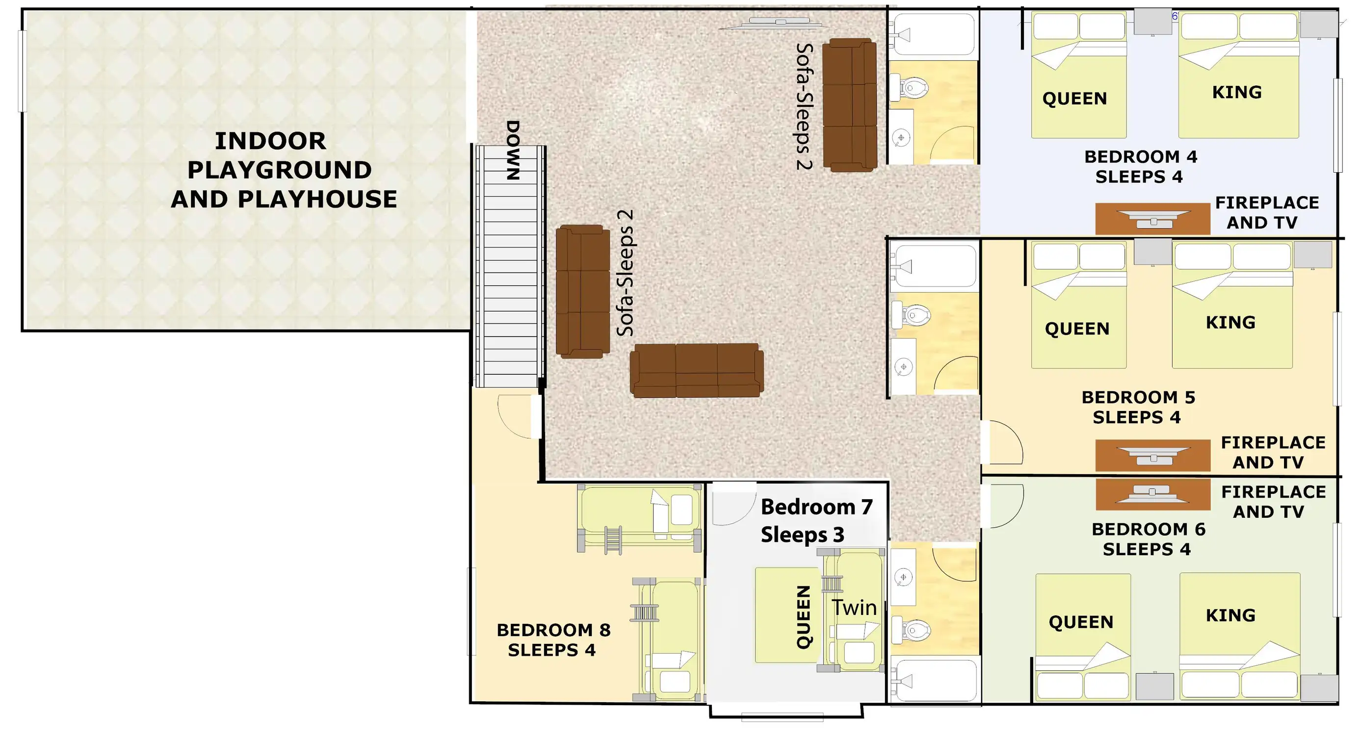Cobalt is the North unit in the Triplex. It is fully furnished and sleeps 38 guests on 4369 sq ft, with 8 bedrooms, 6.5 baths, patio with fire pit, and 2 large great rooms.